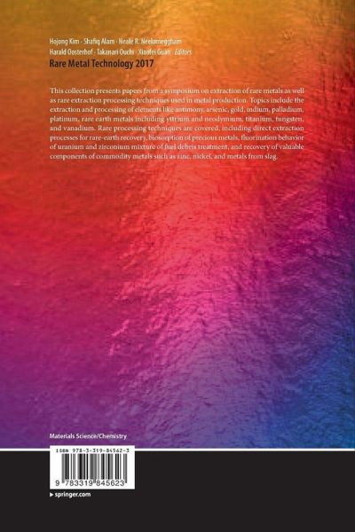 This collection presents papers from a symposium on extraction of rare metals as well as rare extraction processing techniques used in metal production. Topics include the extraction and processing of elements like antimony, arsenic, gold, indium, palladium, platinum, rare earth metals including yttrium and neodymium, titanium, tungsten, and vanadium. Rare processing techniques are covered, including direct extraction processes for rare-earth recovery, biosorption of precious metals, fluorination behavior of uranium and zirconium mixture of fuel debris treatment, and recovery of valuable components of commodity metals such as zinc, nickel, and metals from slag.