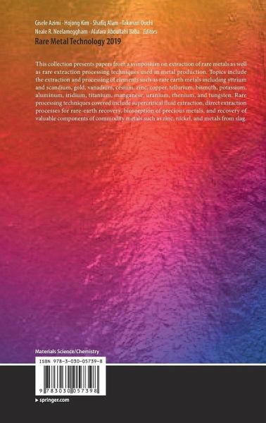 This collection presents papers from a symposium on extraction of rare metals as well as rare extraction processing techniques used in metal production. Topics include the extraction and processing of elements such as rare earth metals including yttrium and scandium, gold, vanadium, cesium, zinc, copper, tellurium, bismuth, potassium, aluminum, iridium, titanium, manganese, uranium, rhenium, and tungsten. Rare processing techniques covered include supercritical fluid extraction, direct extraction processes for rare-earth recovery, biosorption of precious metals, and recovery of valuable components of commodity metals such as zinc, nickel, and metals from slag.