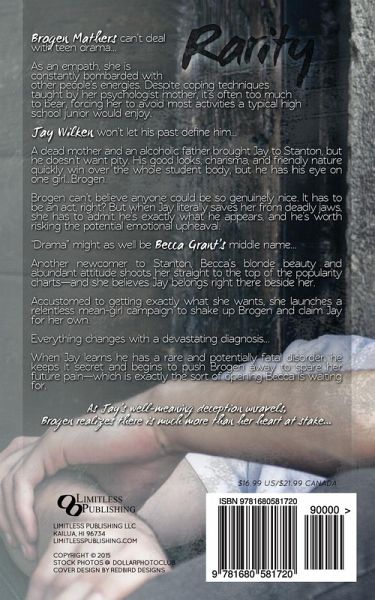 Brogen Mathers can't deal with teen drama... As an empath, she is constantly bombarded with other people's energies. Despite coping techniques taught by her psychologist mother, it's often too much to bear, forcing her to avoid most activities a typical high school junior would enjoy. Jay Wilken won't let his past define him... A dead mother and an alcoholic father brought Jay to Stanton, but he doesn't want pity. His good looks, charisma, and friendly nature quickly win over the whole student body, but he has his eye on one girl...Brogen. Brogen can't believe anyone could be so genuinely nice. It has to be an act, right? But when Jay literally saves her from deadly jaws, she has to admit he's exactly what he appears, and he's worth risking the potential emotional upheaval. "Drama" might as well be Becca Grant's middle name... Another newcomer to Stanton, Becca's blonde beauty and abundant attitude shoots her straight to the top of the popularity charts-and she believes Jay belongs right there beside her. Accustomed to getting exactly what she wants, she launches a relentless mean-girl campaign to shake up Brogen and claim Jay for her own. Everything changes with a devastating diagnosis... When Jay learns he has a rare and potentially fatal disorder, he keeps it secret and begins to push Brogen away to spare her future pain-which is exactly the sort of opening Becca is waiting for. As Jay's well-meaning deception unravels, Brogen realizes there is much more than her heart at stake... But how far is she willing to go to fight for someone she loves?