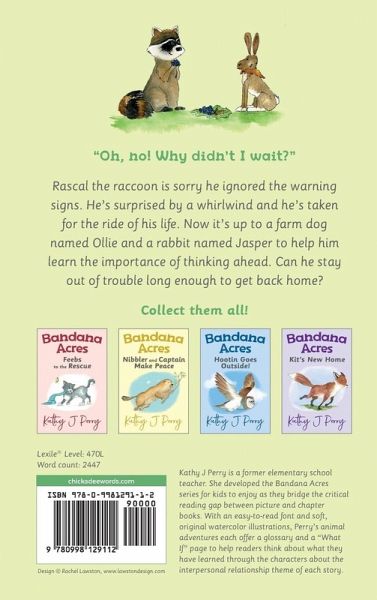 Young, unthinking, and impetuous, Rascal gets swept away by a whirlwind into a forest filled with uncertainty. Injured, but able to walk, he secures a safe place for the night. Jasper, a rabbit, greets him in the morning. He provides breakfast and offers to get Ollie, the farm dog, to help him find his way home. But, Rascal doesn't listen to Jasper's instruction. He wanders away and gets into still more trouble. Fortunately, Ollie arrives in time to save his life. There's a serious discussion about the importance of thinking ahead. Rascal promises to remember this lesson and Ollie leads him home where he shares his adventures, and what he's learned, with his mom.