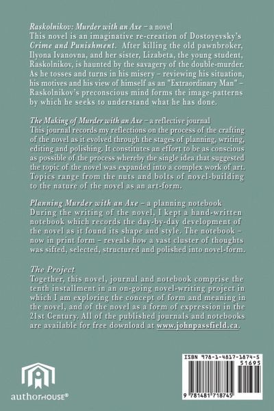 Raskolnikov: Murder with an Axe - a novel This novel is an imaginative re-creation of Dostoyevsky's Crime and Punishment. After killing the old pawnbroker, Ilyona Ivanovna, and her sister, Lizabeta, the young student, Raskolnikov, is haunted by the savagery of the double-murder. As he tosses and turns in his misery - reviewing his situation, his motives and his view of himself as an "Extraordinary Man" - Raskolnikov's preconscious mind forms the image-patterns by which he seeks to understand what he has done. The Making of Murder with an Axe - a reflective journal This journal records my reflections on the process of the crafting of the novel as it evolved through the stages of planning, writing, editing and polishing. It constitutes an effort to be as conscious as possible of the process whereby the single idea that suggested the topic of the novel was expanded into a complex work of art. Topics range from the nuts and bolts of novel-building to the nature of the novel as an art-form. Planning Murder with an Axe - a planning notebook During the writing of the novel, I kept a hand-written notebook which records the day-by-day development of the novel as it found its shape and style. The notebook - now in print form - reveals how a vast cluster of thoughts was sifted, selected, structured and polished into novel-form. The Project Together, this novel, journal and notebook comprise the tenth installment in an on-going novel-writing project in which I am exploring the concept of form and meaning in the novel, and of the novel as a form of expression in the 21st Century. All of the published journals and notebooks are available for free download at www.johnpassfield.ca.
