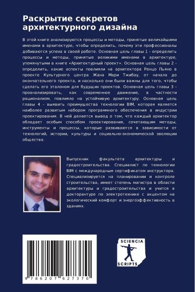 V ätoj knige analiziruütsq processy i metody, prinqtye welichajshimi imenami w arhitekture, chtoby opredelit', pochemu äti professionaly dobiwaütsq uspeha w swoej rabote. Osnownaq cel' glawy 1 - opredelit' processy i metody, prinqtye welikimi imenami w arhitekture, upomqnutymi w knige «Arhitekturnyj proekt». Osnownaq cel' glawy 2 - opredelit', kakie aspekty powliqli na arhitektora Renco P'qno w proekte Kul'turnogo centra Zhana Mari Tzhibau, ot nachala do okonchatel'nogo proekta, i naskol'ko oni byli wazhny dlq togo, chtoby sdelat' ego ätalonom dlq buduschih proektow. Osnownaq cel' glawy 3 - proanalizirowat', kak sowremennoe dwizhenie, w chastnosti racionalizm, powliqlo na ustojchiwuü arhitekturu. Osnownaq cel' glawy 4 - wyqwit' preimuschestwa tehnologii BIM, kotoraq qwlqetsq naibolee razwitym naborom programmnogo obespecheniq w industrii proektirowaniq. V nej delaetsq wywod o tom, chto kazhdyj arhitektor obladaet osobym sposobom proektirowaniq, sochetaüschim metody, instrumenty i processy, kotorye razwiwaütsq w zawisimosti ot tehnologij, istorii, kul'tury i social'no-äkonomicheskoj äwolücii obschestwa.