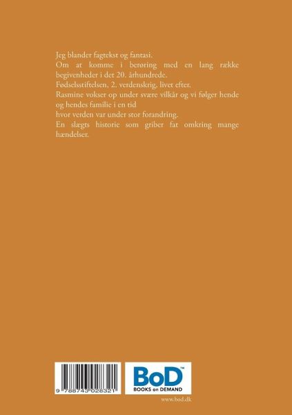 Jeg blander fagtekst og fantasi. Om at komme i berøring med en lang række begivenheder i det 20. århundrede. Fødselsstiftelsen, 2. verdenskrig, livet efter. Rasmine vokser op under svære vilkår og vi følger hende og hendes familie i en tid, hvor verden var under stor forandring. En slægtshistorie som griber fat omkring mange hændelser.
