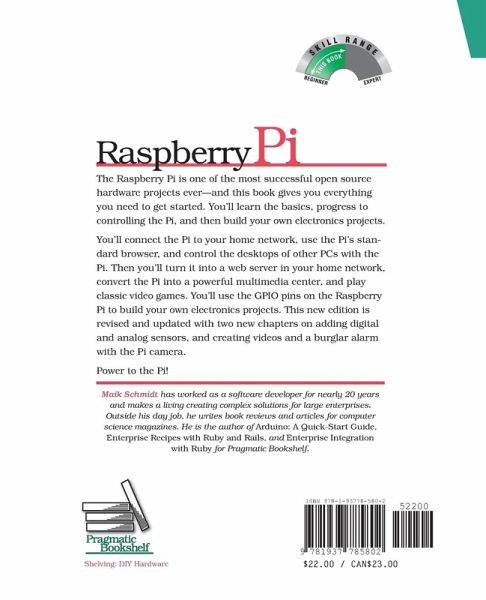 Printed in full color. Most of the book is targeted at beginners in computing and programming. A few parts, such as the small electronics project and setting up a web server, assume some intermediate skills. The Raspberry Pi is one of the most successful open source hardware projects ever. For less than $40, you get a full-blown PC, a multimedia center, and a web server--and this book gives you everything you need to get started. You'll learn the basics, progress to controlling the Pi, and then build your own electronics projects. This new edition is revised and updated with two new chapters on adding digital and analog sensors, and creating videos and a burglar alarm with the Pi camera. Get your Raspberry Pi up and running and doing cool stuff. You'll start with the basics: adding hardware, installing and configuring Debian Linux, and customizing the Pi's firmware to get the most out of your hardware. Then the fun begins. You'll connect the Pi to your home network, surf the web, and tweet messages. You'll learn how to get the most out of Midori, the Pi's standard browser, and control the desktops of other PCs with the Pi. Then you'll explore the Pi's versatility with a series of home projects. Turn it into a web server in your home network; convert the Pi into a powerful multimedia center so you can watch high-definition video and listen to your favorite music; and play classic video games. Then you'll use the GPIO pins on the Raspberry Pi to build your own electronics projects, such as an "out of memory" alarm. You'll learn how to use digital and analog sensors with the Pi, even though the Pi doesn't have analog input ports! Finally, you'll set up the Pi camera, create your own time-lapse videos, and build an automatic e-mailing burglar alarm. Power to the Pi! What You Need You need a Raspberry Pi and several things that you probably already have at home, such as a keyboard, a mouse, a monitor/TV set, and an SD card. To build the electronic projects you need a few cheap parts and the Pi camera.