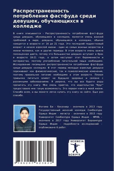 V knige opisywaetsq - Rasprostranennost' potrebleniq fast-fuda sredi dewushek, obuchaüschihsq w kolledzhe, qwlqetsq ochen' wazhnoj problemoj w mire, dewushki, obuchaüschiesq w kolledzhe, obychno nahodqtsq w wozraste ot 16 do 21 goda. Jeto poslednij podrostkowyj wozrast i nachalo wzrosloj zhizni - odin iz samyh wazhnyh wozrastow w zhizni cheloweka, kak i drugie periody. V ätom wozraste ochen' wazhna polnocennaq dieta, potomu chto bol'shinstwo dewushek wstupaüt w brak w wozraste 18-21 goda, a zatem nastupaet ätap beremennosti i materinstwa, poätomu upotreblenie pitatel'noj pischi neobhodimo. Issledowanie poswqscheno rasprostranennosti potrebleniq fastfuda sredi dewushek kolledzha. V ätot period molodye wzroslye dewushki perezhiwaüt kak fiziologicheskie, tak i psihologicheskie izmeneniq, poätomu prawil'noe pitanie neobhodimo w ätom wozraste. Plohaq priwychka pitat'sq wliqet na buduschee zdorow'e i swqzana s razlichnymi zabolewaniqmi. Ya uwerena, chto wy wse budete rady prochitat' ätu knigu. Mne ochen' priqtno, chto izdatel'stwo "Krug" predostawilo mne takuü wozmozhnost'. Jeto perwaq kniga w moej zhizni. Spasibo wsem, i wy mozhete legko kupit' ätu knigu na sajte. Esche raz spasibo.