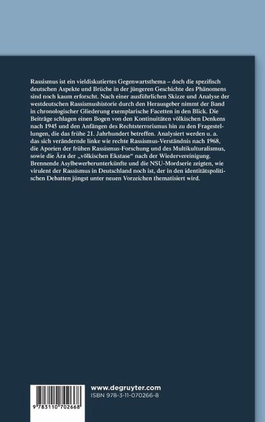 Rassismus ist ein vieldiskutiertes Gegenwartsthema - doch die spezifisch deutschen Aspekte und Brüche in der jüngeren Geschichte des Phänomens sind noch kaum erforscht. Nach einer ausführlichen Skizze und Analyse der westdeutschen Rassismushistorie durch den Herausgeber nimmt der Band in chronologischer Gliederung exemplarische Facetten in den Blick. Die Beiträge schlagen einen Bogen von den Kontinuitäten völkischen Denkens nach 1945 und den Anfängen des Rechtsterrorismus hin zu den Fragestellungen, die das frühe 21. Jahrhundert betreffen. Analysiert werden u. a. das sich verändernde linke wie rechte Rassismus-Verständnis nach 1968, die Aporien der frühen Rassismus-Forschung und des Multikulturalismus, sowie die Ära der "völkischen Ekstase" nach der Wiedervereinigung. Brennende Asylbewerberunterkünfte und die NSU-Mordserie zeigten, wie virulent der Rassismus in Deutschland noch ist, der in den identitätspolitischen Debatten jüngst unter neuen Vorzeichen thematisiert wird.