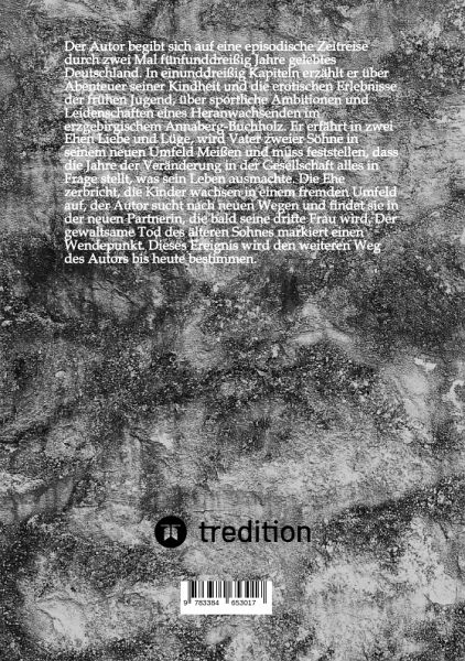 Der Autor begibt sich auf eine episodische Zeitreise durch zwei Mal fünfunddreißig Jahre gelebtes Deutschland. In einunddreißig Kapiteln erzählt er über Abenteuer seiner Kindheit und die erotischen Erlebnisse der frühen Jugend, über sportliche Ambitionen und Leidenschaften eines Heranwachsenden im erzgebirgischem Annaberg-Buchholz. Er erfährt in zwei Ehen Liebe und Lüge, wird Vater zweier Söhne in seinem neuen Umfeld Meißen und muss feststellen, dass die Jahre der Veränderung in der Gesellschaft alles in Frage stellt, was sein Leben ausmachte. Die Ehe zerbricht, die Kinder wachsen in einem…mehr