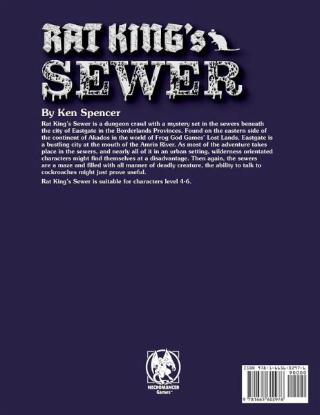 Rat King's Sewer Rat King's Sewer is a dungeon crawl with a mystery set in the sewers beneath the city of Eastgate in the Borderlands Provinces. found on the eastern side of the continent of Akados in the world of Frog God Games' Lost Lands, Eastgate is a bustling city at the mouth of the Amrin River. As most of the adventure takes place in the sewers, and nearly all of it in an urban setting, wilderness oriented characters might find themselves at a disadvantage. Then again, the sewers are a maze and filled all manner of deadly creature, the ability to talk to cockroaches might just prove useful. Rat King's Sewer is suitable for Tier 2 play.