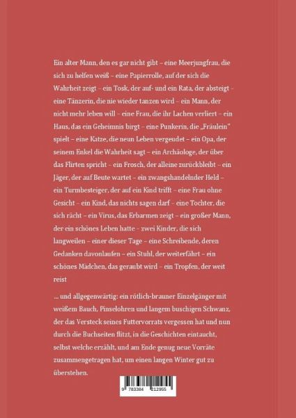 Ein alter Mann, den es gar nicht gibt - eine Meerjungfrau, die sich zu helfen weiß - eine Papierrolle, auf der sich die Wahrheit zeigt - ein Tosk, der auf- und ein Rata, der absteigt - eine Tänzerin, die nie wieder tanzen wird - ein Mann, der nicht mehr leben will - eine Frau, die ihr Lachen verliert - ein Haus, das ein Geheimnis birgt - eine Punkerin, die "Fräulein" spielt - eine Katze, die neun Leben vergeudet - ein Opa, der seinem Enkel die Wahrheit sagt - ein Archäologe, der über das Flirten spricht - ein Frosch, der alleine zurückbleibt - ein Jäger, der auf Beute wartet - ein zwangshandelnder Held - ein Turmbesteiger, der auf ein Kind trifft - eine Frau ohne Gesicht - ein Kind, das nichts sagen darf - eine Tochter, die sich rächt - ein Virus, das Erbarmen zeigt - ein großer Mann, der ein schönes Leben hatte - zwei Kinder, die sich langweilen - einer dieser Tage - eine Schreibende, deren Gedanken davonlaufen - ein Stuhl, der weiterfährt - ein schönes Mädchen, das geraubt wird- ein Tropfen, der weit reist... und allgegenwärtig: ein rötlich-brauner Einzelgänger mit weißem Bauch, Pinselohren und langem buschigen Schwanz, der das Versteck seines Futtervorrats vergessen hat und nun durch die Buchseiten flitzt, in die Geschichten eintaucht, selbst welche erzählt, und am Ende genug neue Vorräte zusammengetragen hat, um einen langen Winter gut zu überstehen.