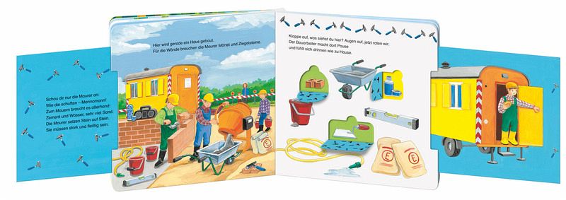 Hier wird ein Haus gebaut, eine Straße planiert und eine Grube gebaggert. Rund um das Thema Baustelle gibt es hinter Klappen und Schieber viel zu erraten. Lustige Reime helfen bei der Lösung.