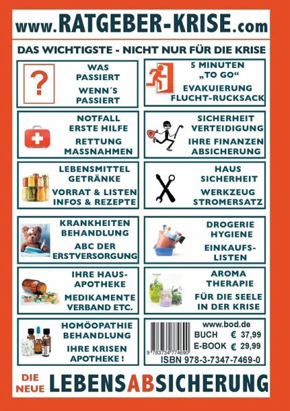 Ratgeber Krise - Dein Überlebensbuch - Das Wichtigste auf einen Blick. Leicht verständlich - mit Übersichten und Listen - Vorsorge - Not - Vorrat - Erledigungen - Erste Hilfe - Sicherheit - Verteidigung - Finanzen - Evakuierung - Flucht - Lebensmittel - Getränke - Drogerie - Hygiene - Apotheke - Arzneien - Homöopathie - Behandlungsmöglichkeiten bei Krankheiten - Verhalten in Notfällen - Werkzeug - Absicherung Ihres Zuhause - Stromersatz - Aroma Therapie für die Seele in der Krise. Dieses Buch zeigt Ihnen die bestmögliche Vorbereitung für den Ernstfall und das Verhalten während einer Krise. Auch für den Schnelleinstieg geeignet - sichern Sie sich und Ihre Familie ab. Es ist die beste Absicherung - Ihre quasi Lebensversicherung für die Krise. Die Welt ist im Wandel. Unwetter, Feuer, Überschwemmung, Terror, Krieg, Seuchen oder Finanzcrash - so sollten Sie bestens vorbereitet sein um in Gefahrensituationen zu Hause bleiben zu können. Sorgen Sie vor!