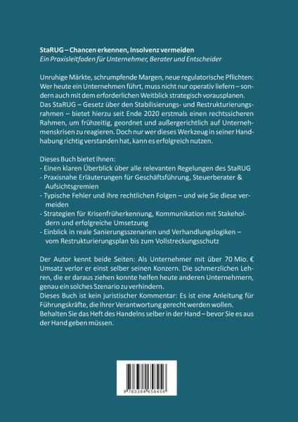 StaRUG - Chancen erkennen, Insolvenz vermeiden - Ein Praxisleitfaden für Unternehmer, Berater und EntscheiderUnruhige Märkte, schrumpfende Margen, neue regulatorische Pflichten: Wer heute ein Unternehmen führt, muss nicht nur operativ liefern - sondern auch mit dem erforderlichen Weitblick strategisch vorausplanen.Das StaRUG - Gesetz über den Stabilisierungs- und Restrukturierungsrahmen - bietet hierzu seit Ende 2020 erstmals einen rechtssicheren Rahmen, um frühzeitig, geordnet und außergerichtlich auf Unternehmenskrisen zu reagieren. Doch nur wer dieses Werkzeug in seiner Handhabung richtig verstanden hat, kann es erfolgreich nutzen.Dieses Buch bietet Ihnen: Einen klaren Überblick über alle relevanten Regelungen des StaRUG Praxisnahe Erläuterungen für Geschäftsführung, Steuerberater & Aufsichtsgremien Typische Fehler und ihre rechtlichen Folgen - und wie Sie diese vermeiden Strategien für Krisenfrüherkennung, Kommunikation mit Stakeholdern und erfolgreiche Umsetzung Einblick in reale Sanierungsszenarien und Verhandlungslogiken - vom Restrukturierungsplan bis zum VollstreckungsschutzDer Autor kennt beide Seiten: Als Unternehmer mit über 70 Mio. EUR Umsatz verlor er einst selber seinen Konzern. Die schmerzlichen Lehren, die er daraus ziehen konnte helfen heute anderen Unternehmern, genau ein solches Szenario zu verhindern.Dieses Buch ist kein juristischer Kommentar: Es ist eine Anleitung für Führungskräfte, die Ihrer Verantwortung gerecht werden wollen.Behalten Sie das Heft des Handelns selber in der Hand - bevor Sie es aus der Hand geben müssen.Jetzt einfach anrufen und unverbindlich beraten lassen: 030 - 509 306 719Oder senden Sie mir eine eMail an info@starug-berater.dehttps://StaRUG-Berater.dehttps://Fortfuehrungsprognose24.de