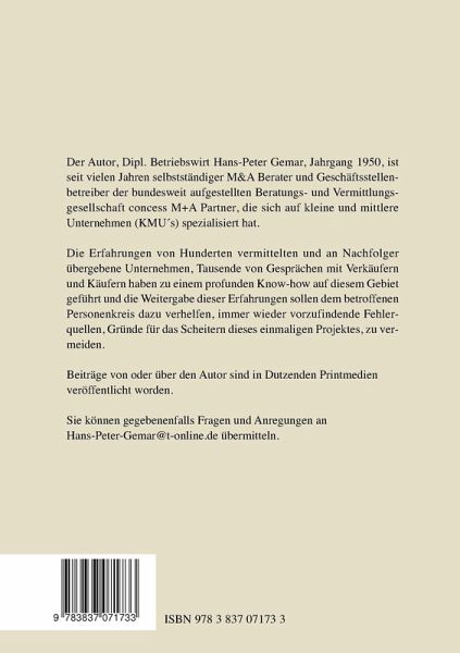 Wenn Sie vor der Frage stehen: wie verkaufe ich mein Unternehmen?, dann liefert Ihnen dieses Buch einen praktischen Leitfaden für eine erfolgreiche Umsetzung. Es werden steuerliche Gesichtspunkte behandelt, Fragen zur Unternehmensbewertung beantwortet, aber auch insbesondere auf methodische Gesichtspunkte hingewiesen, wie auch auf psychologische Barrieren, Verhaltungsmuster und Erwartungshaltungen Ihrer Zielgruppe. Unternehmensverkauf ist ein Thema mit interdisziplinärem Charakter. Verschiedene Teilaspekte, Abfolgen von Ereignissen müssen systematisch in der richtigen Reihenfolge abgearbeitet werden und nur die richtige Kombination sämtlicher Mosaiksteine wird den gewünschten Erfolg zeitigen. Wenn Sie es bisher gewohnt waren, schwer verständliche, wissenschaftliche oder theoretische Beiträge zu einzelnen Teilaspekten zu lesen, so finden Sie hier einen praktischen Ratgeber, einen Aktionsfahrplan, der den gesamten Prozess Schritt für Schritt auf 220 Seiten in leicht verständlicher Sprache beschreibt und die notwendigen Muster-Dokumente und Checklisten liefert.Dieser Ratgeber erschien erstmals 2008 und zwischenzeitlich wurde der Inhalt mehrfach aktualisiert und erweitert, zuletzt im Februar 2015. Der Ratgeber befindet sich zudem auf den Empfehlungslisten verschiedener Handelskammern.Der Autor ist seit über 16 Jahren einer der Geschäftsstellenleiter der bundesweiten Concess M+A Partner, einem Unternehmen, das seit Gründung viele hundert Transaktionen erfolgreich initiiert und durchgeführt hat.