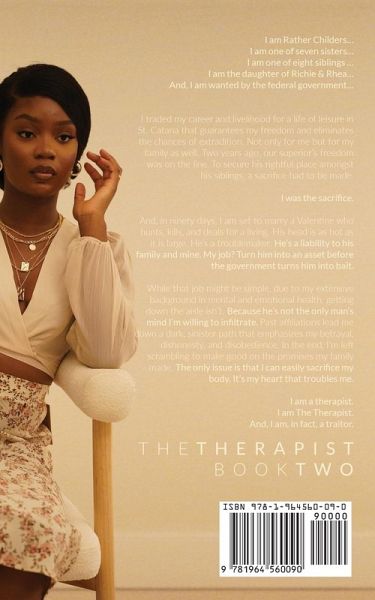 I am Rather Childers... I am one of seven women... I am one of eight siblings ... I am the daughter of Richie & Rhea... And, I am wanted by the federal government... I traded my career and livelihood for a life of leisure in St. Catana that guarantees my freedom and eliminates the chances of extradition. Not only for me but for my family as well. Two years ago, our superior's freedom was on the line. To secure his rightful place amongst his siblings, a sacrifice had to be made. I was the sacrifice. And, in ninety days, I am set to marry a Valentine who hunts, kills, and deals for a living. His head is as hot as it is large. He's a troublemaker. He's a liability to his family and mine. My job? Turn him into an asset before the government turns him into bait. While that job might be simple, due to my extensive background in mental and emotional health, getting down the aisle isn't. Because he's not the only man's mind I'm willing to infiltrate. Past affiliations lead me down a dark, sinister path that emphasizes my betrayal, dishonesty, and disobedience. In the end, I'm left scrambling to make good on the promises my family made. The only issue is that I could easily sacrifice my body. It was my heart that troubled me. I am a therapist. I am The Therapist. And, I am, in fact, a traitor.