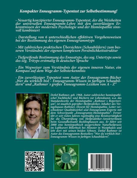 Kompakter Enneagramm-Typentest zur Selbstbestimmung!- Neuartig konzipierter Enneagramm-Typentest, der die Weisheiten der universellen Enneagramm-Lehre mit den zuverlässigen Erkenntnissen der modernen Psychologie und der Homöopathie sinnvoll kombiniert- Darstellung von 6 unterschiedlichen effektiven Vorgehensweisen bei der Bestimmung des eigenen Enneagrammtyps- Mit zahlreichen praktischen Übersichten (Schaubildern) zum besseren Verständnis der eigenen komplexen Persönlichkeitsstruktur- Tiefgreifende Bestimmung des Enneatyps, des sog. Untertyps sowie des sog. Trityps erstmalig in deutscher Sprache- Ein Wegweiser zum Verständnis der eigenen inneren Natur, ein Kompass auf dem Wege der SelbsterkenntnisEin zuverlässiger Typentest vom Autor der Enneagramm-Bücher Wer du wirklich bist - Enneagramm-Wissen in farbigen Schaubildern und Rathmer`s großes Enneagramm-Lexikon von A - Z