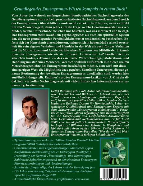 Vom Autor des weltweit umfangreichsten homöopathischen Nachschlagewerks der Gemütssymptome nun auch ein praxisorientiertes Nachschlagewerk aus dem Bereich des Enneagramms - übersichtlich - umfassend - strukturiert! Immer, wenn es direkt um den Menschen geht, dann geht es um die Frage, welche Gemeinsamkeiten uns verbinden, welche Unterschiede zwischen uns bestehen, was uns motiviert und bewegt. Das Enneagramm stellt sowohl ein psychologisches als auch ein spirituelles System dar, die neun grundlegenden Persönlichkeitsmuster tendenziell zu beschreiben. Befasst sich der Mensch mit diesen Mustern, steigert sich in hohem Maße seine Bewusstheit für sein eigenes Verhalten und Handeln in der Welt als auch für das Verhalten und die Motivationen und Antriebskräfte seiner Mitmenschen. Mithilfe der Erkenntnisse des Enneagramms, wie wir sie in diesem Lexikon von A-Z facettenreich beschrieben finden, erkennen wir das essenzielle Wahrnehmungs-, Motivations- und Handlungsmuster eines Menschen. Wer sich wirklich ausführlich mit dieser uralten Menschentypenlehre des Enneagramms beschäftigen möchte, dem wird mit diesem einzigartigen Werk die Möglichkeit dazu gegeben. Sämtliche Untertypen, die zur genauen Bestimmung des jeweiligen Enneagrammtyps unerlässlich sind, werden hier ausführlich dargestellt. Rathmer's großes Enneagramm-Lexikonvon A-Z ist ein didaktisch wertvolles Nachschlagewerk mit vielen hilfreichen Informationen zur genauen Typbestimmung.