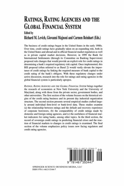 Ratings, Rating Agencies and the Global Financial System brings together the research of economists at New York University and the University of Maryland, along with those from the private sector, government bodies, and other universities. The first section of the volume focuses on the historical origins of the credit rating business and its present day industrial organization structure. The second section presents several empirical studies crafted largely around individual firm-level or bank-level data. These studies examine (a) the relationship between ratings and the default and recovery experience of corporate borrowers, (b) the comparability of credit ratings made by domestic and foreign rating agencies, and (c) the usefulness of financial market indicators for rating banks, among other topics. In the third section, the record of sovereign credit ratings in predicting financial crises and the reaction of financial markets to changes in credit ratings is examined. The final section of the volume emphasizes policy issues now facing regulators and credit rating agencies.