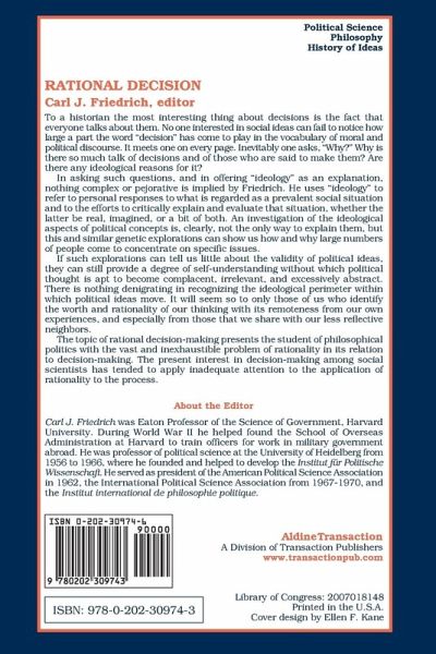 To a historian the most interesting thing about decisions is the fact that everyone talks about them. No one interested in social ideas can fail to notice how large a part the word "decision" has come to play in the vocabulary of moral and political discourse. It meets one on every page. Inevitably one asks, "Why?" Why is there so much talk of decisions and of those who are said to make them? Are there any ideological reasons for it?In asking such questions, and in offering "ideology" as an explanation, nothing complex or pejorative is implied by Friedrich. He uses "ideology" to refer to personal responses to what is regarded as a prevalent social situation and to the efforts to critically explain and evaluate that situation, whether the latter be real, imagined, or a bit of both. An investigation of the ideological aspects of political concepts is, clearly, not the only way to explain them, but this and similar genetic explorations can show us how and why large numbers of people come to concentrate on specific issues.If such explorations can tell us little about the validity of political ideas, they can still provide a degree of self-understanding without which political thought is apt to become complacent, irrelevant, and excessively abstract. There is nothing denigrating in recognizing the ideological perimeter within which political ideas move. It will seem so to only those of us who identify the worth and rationality of our thinking with its remoteness from our own experiences, and especially from those that we share with our less reflective neighbors.The topic of rational decision-making presents the student of philosophical politics with the vast and inexhaustible problem of rationality in its relation to decision-making. The present interest in decision-making among social scientists has tended to apply inadequate attention to the application of rationality to the process.