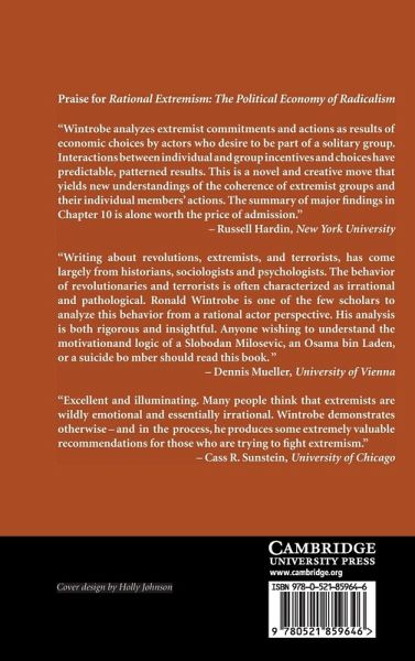 Extremists are people whose ideas or tactics are viewed as outside the mainstream. Looked at this way, extremists are not necessarily twisted or evil. But they can be, especially when they are intolerant and violent. What makes extremists turn violent? This 2006 book assumes that extremists are rational: given their ends, they choose the best means to achieve them. The analysis explains why extremist leaders use the tactics they do, and why they are often insensitive to punishment and to loss of life. It also explains how rational people can be motivated to die for the cause. The book covers different aspects of extremism such as revolution, suicide terrorism, and global jihad. The arguments are illustrated with important episodes of extremism, including the French Revolution, the rise of nationalism in Yugoslavia under Milosevic, and the emergence of suicide terror and Al Qaeda today.