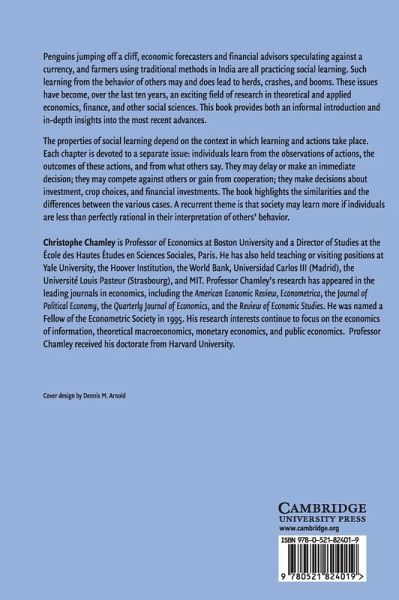 Penguins jumping off a cliff, economic forecasters and financial advisors speculating against a currency, and farmers using traditional methods in India are all practising social learning. Such learning from the behavior of others may and does lead to herds, crashes, and booms. These issues have become, over the last ten years, an exciting field of research in theoretical and applied economics, finance, and in other social sciences. This book provides both an informal introduction and in-depth insights into the subject. Each chapter is devoted to a separate issue: individuals learn from the observations of actions, the outcomes of these actions, and from what others say. They may delay or make an immediate decision; they may compete against others or gain from cooperation; they make decisions about investment, crop choices, and financial investments. The book highlights the similarities and the differences between the various cases.
