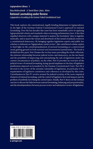 Foreword; Luc J. Wintgens.- 1 On the "Legisprudential Turn" in Judicial Review: An Introduction; A. Daniel Oliver-Lalana and Klaus Meßerschmidt.- Part I. Judicial Review, Democracy, and Legislation Theory.- 2 Constitutional Courts and Democracy. Facets of an Ambivalent Relationship; Gertrude Lübe-Wolff.- 3 Paths towards Better Legislation, Detours and Dead-ends: An Appraisal of Consultation with Independent Experts, Justifications for Legislation, Impact Assessments and Controls of Efficacy; Helmuth Schulze-FielitzPart.- II. Judicial Review of Legislative Rationality and Justification.- 4 Rationality Requirements on Parliamentary Legislation under a Democratic Rule of Law; Bernd Grzeszick.- 5 The Generality of the Law. The Law as a Necessary Guarantor of Freedom, Equality and Democracy, and the Differentiated Role of the Federal Constitutional Court as a Watchdog; Gregor Kirchhof.- 6 On Constitutional Duties to Give Reasons for Legislative Acts; Christian Waldhoff.- Part III. JudicialReview of Legislative Consistency and Systematicity.- 7 The Obligation of Consistency in Lawmaking. Using the Example of the Ban on the Private Sale of Public Lottery Tickets and its Review by the Federal Constitutional Court; Christian Bumke.- Inconsistent Legislation; Matthias Rossi.- 9 Judicial Review of Tax Laws: The Coherence Requirement; Roland Ismer.- Part IV. Judicial Review of Legislative Facts and Impacts.- 10 Legislative Margins of Appreciation as the Result of Rational Lawmaking; Christian Bickenbach.- 11 Due Post-Legislative Process? On the Lawmakers' Constitutional Duties of Monitoring and Revision; A. Daniel Oliver-Lalana.- 12 Efficacy, Effectiveness, Efficiency - From Judicial to Managerial Rationality; Ulrich Karpen.- 13 Symbolic Legislation under Judicial Control; Angelika Siehr.- Part V. Legislative Balancing, Proportionality, and Process Review.- 14 Rational Lawmaking, Proportionality and Balancing; Jan Sieckmann.- 15 The Procedural Review of Legislation and the Substantive Review of Legislation - Opponents or Allies?; Klaus Meßerschmidt.- Index.- About the Authors.