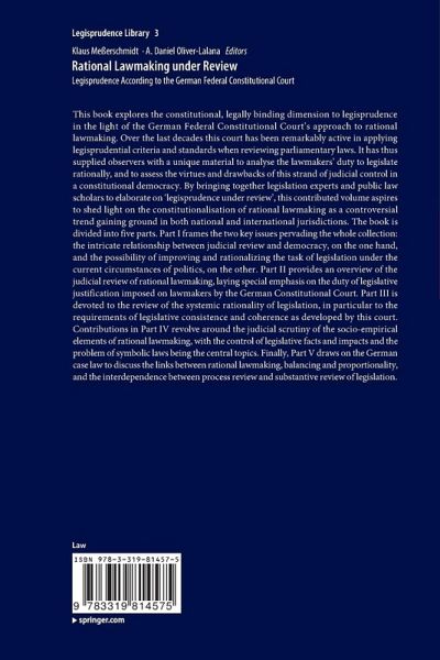Foreword; Luc J. Wintgens.- 1 On the "Legisprudential Turn" in Judicial Review: An Introduction; A. Daniel Oliver-Lalana and Klaus Meßerschmidt.- Part I. Judicial Review, Democracy, and Legislation Theory.- 2 Constitutional Courts and Democracy. Facets of an Ambivalent Relationship; Gertrude Lübe-Wolff.- 3 Paths towards Better Legislation, Detours and Dead-ends: An Appraisal of Consultation with Independent Experts, Justifications for Legislation, Impact Assessments and Controls of Efficacy; Helmuth Schulze-FielitzPart.- II. Judicial Review of Legislative Rationality and Justification.- 4 Rationality Requirements on Parliamentary Legislation under a Democratic Rule of Law; Bernd Grzeszick.- 5 The Generality of the Law. The Law as a Necessary Guarantor of Freedom, Equality and Democracy, and the Differentiated Role of the Federal Constitutional Court as a Watchdog; Gregor Kirchhof.- 6 On Constitutional Duties to Give Reasons for Legislative Acts; Christian Waldhoff.- Part III. JudicialReview of Legislative Consistency and Systematicity.- 7 The Obligation of Consistency in Lawmaking. Using the Example of the Ban on the Private Sale of Public Lottery Tickets and its Review by the Federal Constitutional Court; Christian Bumke.- Inconsistent Legislation; Matthias Rossi.- 9 Judicial Review of Tax Laws: The Coherence Requirement; Roland Ismer.- Part IV. Judicial Review of Legislative Facts and Impacts.- 10 Legislative Margins of Appreciation as the Result of Rational Lawmaking; Christian Bickenbach.- 11 Due Post-Legislative Process? On the Lawmakers' Constitutional Duties of Monitoring and Revision; A. Daniel Oliver-Lalana.- 12 Efficacy, Effectiveness, Efficiency - From Judicial to Managerial Rationality; Ulrich Karpen.- 13 Symbolic Legislation under Judicial Control; Angelika Siehr.- Part V. Legislative Balancing, Proportionality, and Process Review.- 14 Rational Lawmaking, Proportionality and Balancing; Jan Sieckmann.- 15 The Procedural Review of Legislation and the Substantive Review of Legislation - Opponents or Allies?; Klaus Meßerschmidt.- Index.- About the Authors.