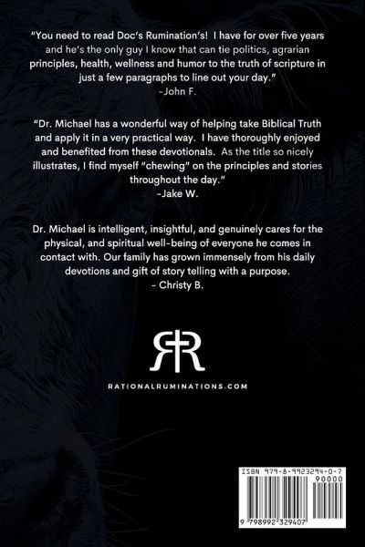 This culmination of daily scriptural rumination's was born out of a place of deep pain and great hope. What started as a simple pre-dawn sharing of scriptural encouragement with my two brothers (following the loss of my 24 year old son, and my older brother's wife in the late fall of 2018) turned into a daily blessing to help us understand the tragedies that took place. I started to share these with my children, then a close brother in Christ who also lost his 23 year old son three months after Michael, another young dad needing encouragement and slowly it grew into what it is today reaching many friends and friends of friends in need of encouragement. After more than five years of writing daily "rumination's" and texting them out, one copy, one paste, and one send, at time, you now hold a portion of this labor of love in your hands. May these "Rational Rumination's" bless and enrich your walk with Christ as much as they have enriched and blessed my walk with Him in writing them. The decision to begin this series in Jeremiah was no coincidence. Jeremiah's message, though often delivered in times of great hardship and uncertainty, is one of hope, renewal, and God's unwavering faithfulness. For a project inspired by personal loss and a longing for encouragement, Jeremiah's steadfast reliance on God in the face of adversity mirrors the heart of these writings. It is my prayer that this starting point provides a firm foundation for finding peace, purpose, and God's promises in the midst of life's challenges.