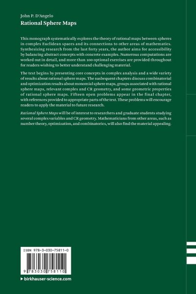 The text begins by presenting core concepts in complex analysis and a wide variety of results about rational sphere maps. The subsequent chapters discuss combinatorial and optimization results about monomial sphere maps, groups associated with rational sphere maps, relevant complex and CR geometry, and some geometric properties of rational sphere maps. Fifteen open problems appear in the final chapter, with references provided to appropriate parts of the text. These problemswill encourage readers to apply the material to future research.