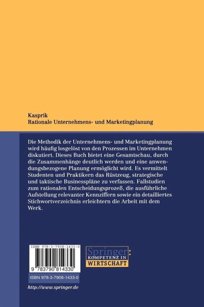 Wissenschaftliche und praxisorientierte Aspekte einer anwendungsbezogenen Unternehmens- und Marketingplanung Die Methodik der Unternehmens- und Marketingplanung wird häufig losgelöst von den Prozessen im Unternehmen diskutiert. Dieses Buch bietet eine Gesamtschau, durch die Zusammenhänge deutlich werden und eine anwendungsbezogene Planung ermöglicht wird. Es vermittelt Studenten und Praktikern das Rüstzeug, strategische und taktische Businesspläne zu verfassen. Fallstudien zum rationalen Entscheidungsprozeß, die ausführliche Aufstellung relevanter Kennziffern sowie ein detailliertes Stichwortverzeichnis erleichtern die Arbeit mit dem Werk.