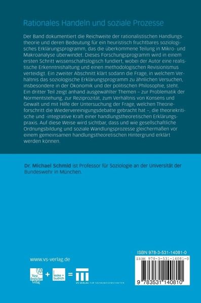 Der Band dokumentiert die Reichweite der rationalistischen Handlungstheorie und deren Bedeutung für ein heuristisch fruchtbares soziologisches Erklärungsprogramm, das die überkommene Teilung in Mikro- und Makroanalyse überwindet. Dieses Forschungsprogramm wird in einem ersten Schritt wissenschaftslogisch fundiert, wobei der Autor eine realistische Erkenntnishaltung und einen methodologischen Revisionismus verteidigt. Ein zweiter Abschnitt klärt sodann die Frage, in welchem Verhältnis das soziologische Erklärungsprogramm zu ähnlichen Versuchen, insbesondere in der Ökonomik und der politischen Philosophie, steht. Ein dritter Teil zeigt anhand ausgewählter Themen - zur Problematik der Normentstehung, zur Reziprozität, zum Verhältnis von Konsens und Gewalt und mit Hilfe der Untersuchung der Frage, welchen Theoriefortschritt die Wiedervereinigungsdebatte gebracht hat -, die theoriekritische und -integrative Kraft einer handlungstheoretischen Erklärungspraxis. Auf diese Weise wird sichtbar, dass und wie gesellschaftliche Ordnungsbildung und soziale Wandlungsprozesse gleichermaßen vor einem gemeinsamen handlungstheoretischen Hintergrund erklärt werden können.