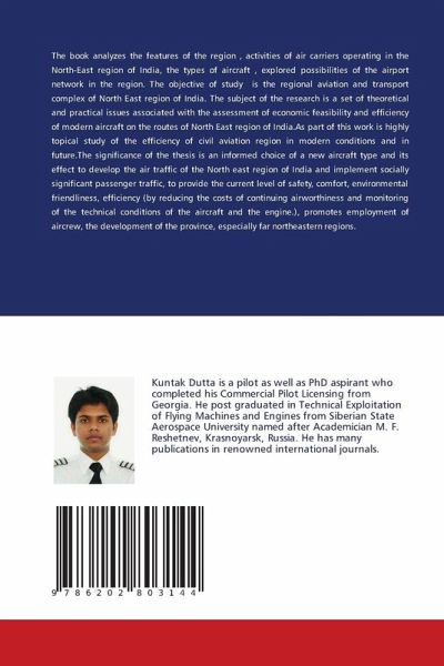 The book analyzes the features of the region , activities of air carriers operating in the North-East region of India, the types of aircraft , explored possibilities of the airport network in the region. The objective of study is the regional aviation and transport complex of North East region of India. The subject of the research is a set of theoretical and practical issues associated with the assessment of economic feasibility and efficiency of modern aircraft on the routes of North East region of India.As part of this work is highly topical study of the efficiency of civil aviation region in modern conditions and in future.The significance of the thesis is an informed choice of a new aircraft type and its effect to develop the air traffic of the North east region of India and implement socially significant passenger traffic, to provide the current level of safety, comfort, environmental friendliness, efficiency (by reducing the costs of continuing airworthiness and monitoring of the technical conditions of the aircraft and the engine.), promotes employment of aircrew, the development of the province, especially far northeastern regions.