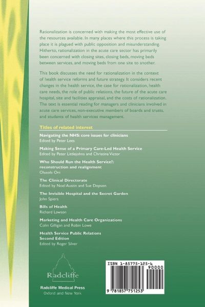 Rationalization is concerned with making the most effective use of the resources available. In many places where this process is taking place it is plagued with public opposition and misunderstanding. Hitherto rationalization in the acute care sector has primarily been concerned with closing sites closing beds moving beds between services and moving beds from one site to another. This book discusses the need for rationalization in the context of health service reforms and future strategy. It considers recent changes in the health service the case for rationalization health care needs the role of public relations the future of the acute care hospital site and facilities appraisal and the costs of rationalization. The text is essential reading for managers and clinicians involved in acute care services non-executive members of boards and trusts and students of health services management.