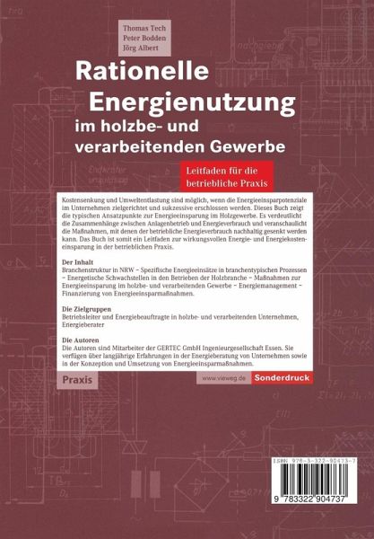 Kostensenkung und Umweltentlastung sind möglich, wenn die Energieeinsparpotenziale im Unternehmen zielgerichtet und sukzessive erschlossen werden. Dieses Buch zeigt die typischen Ansatzpunkte zur Energieeinsparung im Holzgewerbe. Es verdeutlicht die Zusammenhänge zwischen Anlagenbetrieb und Energieverbrauch und veranschaulicht die Maßnahmen, mit denen der betriebliche Energieverbrauch nachhaltig gesenkt werden kann. Das Buch ist somit ein Leitfaden zur wirkungsvollen Energie- und Energiekosteneinsparung in der betrieblichen Praxis.