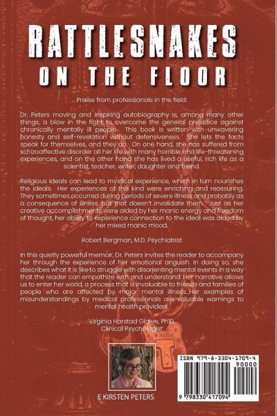 Rattlesnakes on the Floor is a memoir of what the author has gone through in 60 years of living with major mental illness (schizoaffective disorder). It recounts psychotic episodes and strong delusions. The book also explains how some mental health professionals were very far from useful. One Harvard psychiatrist was adamant that the author's problems stemmed from the fact she had been raised in church. In fact, religious life has helped her survive her problems and accomplish many goals. She is now stable on five medications taken daily.