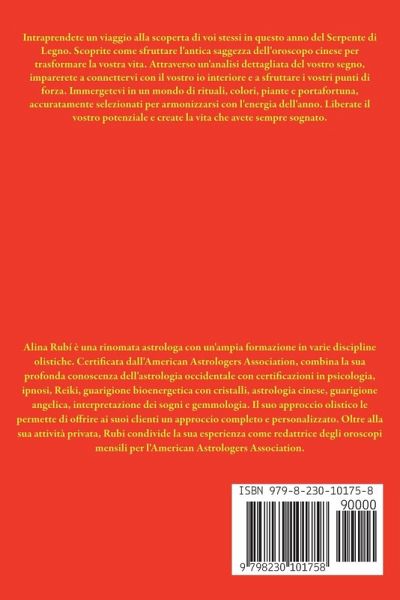 Intraprendete un viaggio alla scoperta di voi stessi in questo anno del Serpente di Legno. Scoprite come sfruttare l'antica saggezza dell'oroscopo cinese per trasformare la vostra vita. Attraverso un'analisi dettagliata del vostro segno, imparerete a connettervi con il vostro io interiore e a sfruttare i vostri punti di forza. Immergetevi in un mondo di rituali, colori, piante e portafortuna, accuratamente selezionati per armonizzarsi con l'energia dell'anno. Liberate il vostro potenziale e create la vita che avete sempre sognato.