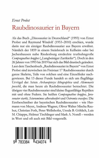 Als das Buch "Dinosaurier in Deutschland" (1993) von Ernst Probst und Raymund Windolf (1953-2010) erschien, wurde darin nur ein einziger Raubdinosaurier aus Bayern erwähnt. Nämlich der 1858 in einem Steinbruch in Kelheim oder bei Jachenhausen nahe Riedenburg entdeckte truthuhngroße Compsognathus longipes ("Langbeiniger Zartkiefer"). Doch in 31 Jahren von 1993 bis 2019 hat sich das Bild drastisch geändert. Laut dem Taschenbuch "Raubdinosaurier in Bayern" von Ernst Probst sind inzwischen im Freistaat 18 Raubdinosaurier durch ganze Skelette, Teile von solchen und eine Einzelfeder nachgewiesen. Bei 14 dieser Funde handelt es sich um flugfähige Urvögel der Arten Archaeopteryx lithographica und Alcmonavis poeschli, die man heute als Raubdinosaurier betrachtet. Die übrigen vier Raubdinosaurier sind kleine flugunfähige Reptilien mit und ohne Federn. Sie heißen Compsognathus longipes, Jura-venator starki, Sciurumimus albersdoerferi und Ostromia crassipes. Die Erstbeschreiber der bayerischen Raubdinosaurier - wie Hermann von Meyer, Andreas Wagner, Oliver Walter Mischa Rauhut, Christian Foth, Peter Wellnhofer, Ursula B. Göhlich, Luis M. Chiappe, Helmut Tischlinger und Mark A. Norell - werden in Wort und oft auch mit Bild vorgestellt.