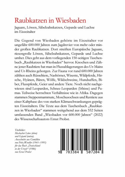 Die Gegend von Wiesbaden gehörte im Eiszeitalter vor ungefähr 600.000 Jahren zum Jagdrevier von mehr oder minder großen Raubkatzen. Dort streiften Europäische Jaguare, riesengroße Löwen, Säbelzahnkatzen, Geparde und Luchse umher. Dies geht aus dem vorliegenden 150-seitigen Taschenbuch "Raubkatzen in Wiesbaden" hervor. Knochen und Zähne jener Raubtiere hat man in Flussablagerungen des Ur-Mains und Ur-Rheins geborgen. Zur Fauna vor rund 600.000 Jahren zählten auch Rüsseltiere, Nashörner, Wisente, Wildpferde, Hirsche, Hyänen, Bären, Wölfe, Wildschweine, Hundsaffen, Biber, Flusspferde, Geier und andere Tiere. Noch nicht nachgewiesen sind Leoparden, Schnee-Leoparden (Irbisse) und Pumas. Teilweise herrschten Verhältnisse wie in Afrika. Dagegen stammen Steppenmammute, Moschusochsen und Rentiere aus einer Kaltphase des von starken Klimaschwankungen geprägten Eiszeitalters. Die Texte aus dem Taschenbuch "Raubkatzen in Wiesbaden" stammen weitgehend aus dem 552 Seiten umfassenden Band "Wiesbaden vor 600.000 Jahren" (2022) des Wissenschaftsautors Ernst Probst.