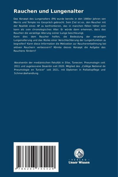 Das Konzept des Lungenalters (PA) wurde bereits in den 1980er Jahren von Morris und Temple ins Gespräch gebracht. Sein Ziel ist es, den Raucher mit der Realität eines AP zu konfrontieren, das in manchen Fällen höher sein kann als sein chronologisches Alter. Er würde dann erkennen, dass das Rauchen die vorzeitige Alterung seiner Lunge beschleunigt.Kann dies dem Raucher helfen, die Bedeutung der vorzeitigen Lungenalterung und das Risiko einer Verschlechterung der Lungenfunktion zu begreifen? Kann diese Information die Motivation zur Raucherentwöhnung bei aktiven Rauchern verbessern? Könnte dieses Konzept die Aufgabe des Rauchens fördern?