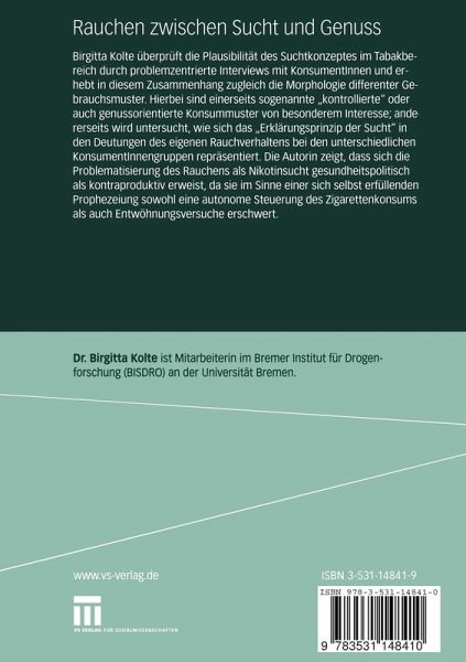 Birgitta Kolte überprüft die Plausibilität des Suchtkonzeptes im Tabakbereich durch problemzentrierte Interviews mit KonsumentInnen und erhebt in diesem Zusammenhang zugleich die Morphologie differenter Gebrauchsmuster. Hierbei sind einerseits sogenannte "kontrollierte" oder auch genussorientierte Konsummuster von besonderem Interesse; andererseits wird untersucht, wie sich das "Erklärungsprinzip der Sucht" in den Deutungen des eigenen Rauchverhaltens bei den unterschiedlichen KonsumentInnengruppen repräsentiert. Die Autorin zeigt, dass sich die Problematisierung des Rauchens als Nikotinsucht gesundheitspolitisch als kontraproduktiv erweist, da sie im Sinne einer sich selbst erfüllenden Prophezeiung sowohl eine autonome Steuerung des Zigarettenkonsums als auch Entwöhnungsversuche erschwert.