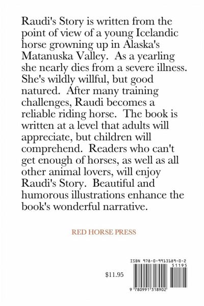 Raudi's Story is written from the point of view of a young Icelandic horse growing up in Alaska's Matanuska Valley. As a yearling, she nearly dies from a severe illness. She's wildly willful but good natured. After many training related challenges, Raudi becomes a reliable riding horse. The book is written at a level that adults will appreciate, but children will comprehend. Readers who can't get enough of horses, as well as all other animal lovers, will enjoy Raudi's Story. Beautiful and humorous illustrations enhance the book's wonderful narrative.