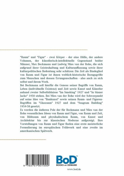 "Raum" und "Figur" - zwei Körper - der eine Hülle, der andere Volumen, der künstlerisch-intellektuelle Gegenstand beider Männer, Max Beckmann und Ludwig Mies van der Rohe, die sich aufgrund ihrer Geisteshaltung und Kulturauffassung sowie ihrer kulturpolitischen Bedeutung sehr schätzen: Die Zeit als Bindeglied von Raum und Figur ist ihnen weltlich-historische Bezugsgröße zum Menschen und dessen Errungenschaften - also auch zu sich selbst und ihrem Werk. Bei Beckmann soll hierfür die Genese seiner Begriffe von Raum, Leben (individuelle Existenz) und Zeit sowie Kunst und Künstler anhand zweier Selbstbildnisse "Im Smoking" 1927 und "In blauer Jacke" 1950 stehen. Bei Mies van der Rohe wird der Schwerpunkt auf seine Idee von "Baukunst" sowie seinen Raum- und Figuren-Begriffen im "Glasraum" 1927 und dem "Seagram Building" 1954-58 gesetzt. Es werden die äußeren Pole der für Beckmann und Mies van der Rohe wesentlichen Ideen von Raum und Figur, von Raum und Zeit, von Bildraum und physikalischem Raum, von Kunst und Architektur bis zur klassischen Moderne aufgezeigt. Ihre Vorstellungen von Raum und Figur finden eine erste meisterliche Formulierung im europäischen Frühwerk und eine zweite im amerikanischen Spätwerk.