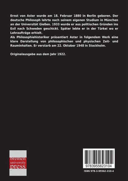 Als Philosophiehistoriker präsentiert Aster in folgendem Werk eine klare Darstellung von philosophischen und physischen Zeit- und Rauminhalten. Er verstarb am 22. Oktober 1948 in Stockholm.