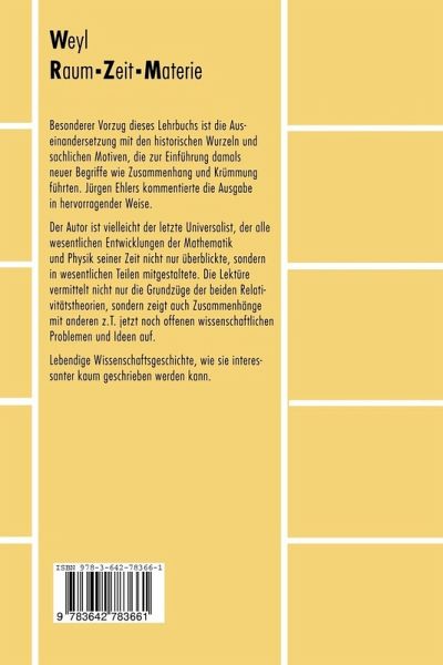 Aus dem Vorwort von Jürgen Ehlers zur 7. Auflage: "Die ... Entwicklung der Physik macht verständlich, warum ein so "altes" Werk wie Raum, Zeit, Materie noch aktuell ist: Die Riemann-Einsteinsche Raumzeitstruktur, die von Weyl so meisterhaft beschrieben und aus ihren mathematischen und physikalischen Wurzeln hervorwachsend dargestellt wird, ist immer noch die physikalisch umfassendste und erfolgreichste Raumzeittheorie, die bisher entwickelt und mit der Erfahrung konfrontiert wurde. (...) Als erstes Lehrbuch der noch neuen Theorie setzt es sich gründlicher als spätere Bücher mit den…mehr