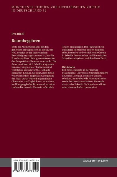 Trotz der Aufmerksamkeit, die den gehenden Protagonisten im Prosawerk W.G. Sebalds in der theoretischen Beschäftigung zugekommen ist, hat die Forschung diese bislang nur selten unter der Perspektive «Flaneur» untersucht. Die Autorin widmet sich Sebalds sorgsamen Inszenierungen dieser Fußreisen und verfolgt sie kritisch vor W.G. Sebalds Benjamin-Lektüre. Sie zeigt, dass die als widersprüchlich aufgefasste Aneignung der Figur durch Walter Benjamin eine Chance ist, das Zugleich von intensiven, im Übergang befindlichen und zerstörerischen Formen der Flanerie in Sebalds Texten aufzuzeigen. Der Flaneur ist ein auffälliger Körper: Wie dessen epiphanische, intensive und vernichtende Gesten in Sebalds theoretisches und literarisches Schreiben eingehen, verfolgt dieses Buch.