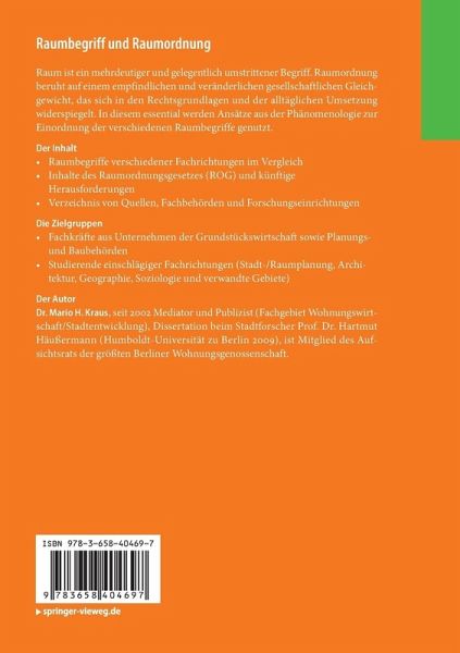 Raum ist ein mehrdeutiger und gelegentlich umstrittener Begriff. Raumordnung beruht auf einem empfindlichen und veränderlichen gesellschaftlichen Gleichgewicht, das sich in den Rechtsgrundlagen und der alltäglichen Umsetzung widerspiegelt. In diesem essential werden Ansätze aus der Phänomenologie zur Einordnung der verschiedenen Raumbegriffe genutzt.