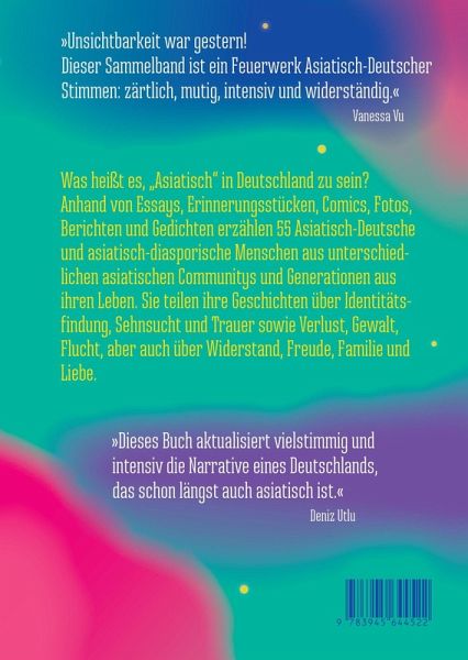 Der erste Sammelband von asiatisch-deutschen, asiatisch-diasporischen Personen und BPoC mit Bezügen zu (Süd-, Ost-, West-, Nord-, Zentral- oder Südost-)Asien!In diesem politisch wichtigen Buch bringen Menschen ihre Stimme zu Gehör und nehmen sich sprachlich Raum, deren Perspektiven in der deutschen Literatur und Gesellschaft bisher wenig gehört worden sind. Dabei reichen asiatische Migrationsgeschichten bereits weit in die Vergangenheit Deutschlands zurück. Die Essays, Erinnerungsstücke, Comics, Fotos und Gedichte erzählen 55 Geschichten über Identitätsfindung, Sehnsucht, über Trauer, Verlust, Freude, Gewalt, Flucht, Widerstand, Familie und Liebe - sie erzählen von Lebensrealitäten asiatischer Communitys in Deutschland.Was bedeutet eigentlich "asiatisch-deutsch" und welche Biografien und Bezüge birgt dieser Begriff? Wie äußert sich anti-asiatischer Rassismus im Alltag, in Redewendungen, in Zuschreibungen, Stereotypen und latenter Ignoranz? Wie erleben asiatisch-diasporische Menschen diesen Rassismus und wie lernen sie, damit umzugehen? Wie gelingt es, sich über teilweise weit verstreute Communitys zu verbinden und gegenseitig zu stärken? Sich tatsächlich raumzunehmen in der Geschichtsschreibung Deutschlands? All diese Fragen greifen die verschiedenen Beiträge persönlich und berührend, politisch und bewegend auf.raumnehmen schließt eine Lücke in den Diskussionen um Rassismus in Deutschland und regt zu neuen Gesprächen und Reflexionen an.