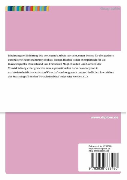 Die vorliegende Arbeit versucht, einen Beitrag für die geplante europäische Raumordnungspolitik zu leisten. Hierbei sollen exemplarisch für die Bundesrepublik Deutschland und Frankreich Möglichkeiten und Grenzen der Verwirklichung einer gemeinsamen supranationalen Rahmenkonzeption in marktwirtschaftlich-oriertierten Wirtschaftsordnungen mit unterschiedlichen Intensitäten des Staatseingriffs in den Wirtschaftsablauf aufgezeigt werden.