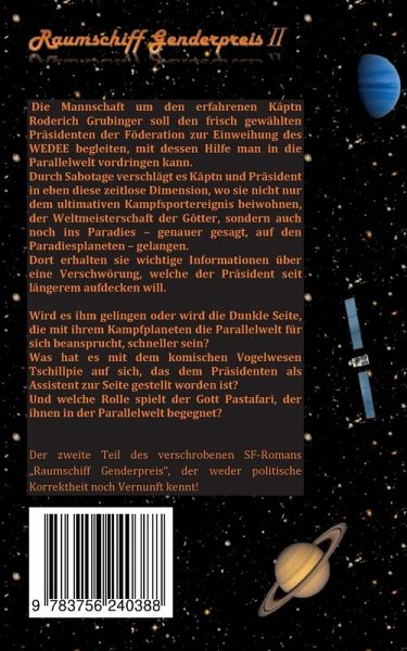 Die Mannschaft um den erfahrenen Käptn Roderich Grubinger soll den frisch gewählten Präsidenten der Föderation zur Einweihung des WEDEE begleiten, mit dessen Hilfe man in die Parallelwelt vordringen kann.Durch Sabotage verschlägt es Käptn und Präsident in eben diese zeitlose Dimension, wo sie nicht nur dem ultimativen Kampfsportereignis beiwohnen, der Weltmeisterschaft der Götter, sondern auch noch ins Paradies - genauer gesagt, auf den Paradiesplaneten - gelangen.Dort erhalten sie wichtige Informationen über eine Verschwörung, welche der Präsident seit längerem aufdecken will.Wird es ihm gelingen oder wird die Dunkle Seite, die mit ihrem Kampfplaneten die Parallelwelt für sich beansprucht, schneller sein?Was hat es mit dem komischen Vogelwesen Tschillpie auf sich, das dem Präsidenten als Assistent zur Seite gestellt worden ist?Und welche Rolle spielt der Gott Pastafari, der ihnen in der Parallelwelt begegnet?Der zweite Teil des verschrobenen SF-Romans Raumschiff Genderpreis, derweder politische Korrektheit noch Vernunft kennt!