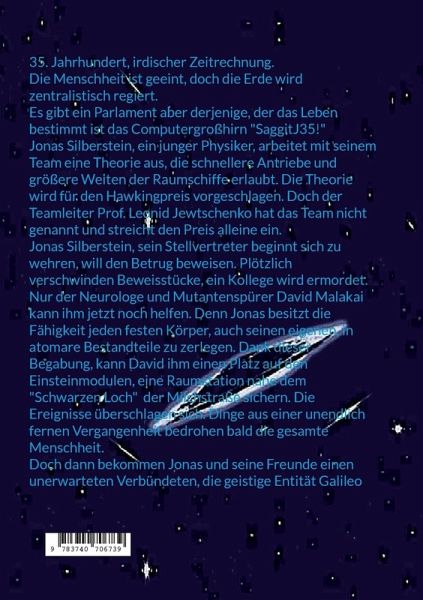 35. Jahrhundert, irdischer Zeitrechnung.Die Menschheit ist geeint, doch die Erde wird zentralistisch regiert.Es gibt ein Parlament aber derjenige, der das Leben bestimmt ist das Computergroßhirn "SaggitJ35!"Jonas Silberstein, ein junger Physiker, arbeitet mit seinem Team eine Theorie aus, die schnellere Antriebe und größere Weiten der Raumschiffe erlaubt. Die Theorie wird für den Hawkingpreis vorgeschlagen. Doch der Teamleiter Prof. Leonid Jewtschenko hat das Team nicht genannt und streicht den Preis alleine ein.Jonas Silberstein, sein Stellvertreter beginnt sich zu wehren, will den Betrug beweisen. Plötzlich verschwinden Beweisstücke, ein Kollege wird ermordet. Nur der Neurologe und Mutantenspürer David Malakai kann ihm jetzt noch helfen. Denn Jonas besitzt die Fähigkeit jeden festen Körper, auch seinen eigenen, in atomare Bestandteile zu zerlegen. Dank dieser Begabung, kann David ihm einen Platz auf den Einsteinmodulen, eine Raumstation nahe dem "Schwarzen Loch" der Milchstraße sichern. Die Ereignisse überschlagen sich. Dinge aus einer unendlich fernen Vergangenheit bedrohen bald die gesamte Menschheit.Doch dann bekommen Jonas und seine Freunde einen unerwarteten Verbündeten, die geistige Entität Galileo