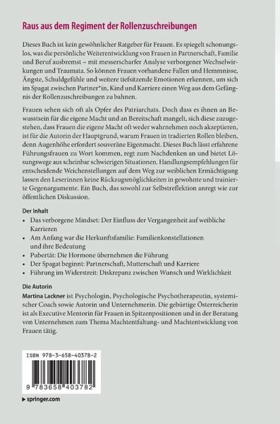 Dieses Buch ist kein gewöhnlicher Ratgeber für Frauen. Es spiegelt schonungslos, was die persönliche Weiterentwicklung von Frauen in Partnerschaft, Familie und Beruf ausbremst - mit messerscharfer Analyse verborgener Wechselwirkungen und Traumata. So können Frauen vorhandene Fallen und Hemmnisse, Ängste, Schuldgefühle und weitere tiefsitzende Emotionen erkennen, um sich im Spagat zwischen Partner_in, Kind und Karriere einen Weg aus dem Gefängnis der Rollenzuschreibungen zu bahnen.Frauen sehen sich oft als Opfer des Patriarchats. Doch dass es ihnen an Bewusstsein für die eigene Macht und an Bereitschaft mangelt, sich diese zuzugestehen, dass Frauen die eigene Macht oft weder wahrnehmen noch akzeptieren, ist für die Autorin der Hauptgrund, warum Frauen in tradierten Rollen bleiben, denn Augenhöhe erfordert souveräne Eigenmacht. Dieses Buch lässt erfahrene Führungsfrauen zu Wort kommen, regt zum Nachdenken an und bietet Lösungswege aus scheinbar schwierigen Situationen. Handlungsempfehlungen für entscheidende Weichenstellungen auf dem Weg zur weiblichen Ermächtigung lassen den Leserinnen keine Rückzugsmöglichkeiten in gewohnte und trainierte Gegenargumente. Ein Buch, das sowohl zur Selbstreflektion anregt wie zur öffentlichen Diskussion.Der Inhalt- Das verborgene Mindset: Der Einfluss der Vergangenheit auf weibliche Karrieren- Am Anfang war die Herkunftsfamilie: Familienkonstellationen und ihre Bedeutung - Pubertät: Die Hormone übernehmen die Führung- Der Spagat beginnt: Partnerschaft, Mutterschaft und Karriere- Führung im Widerstreit: Diskrepanz zwischen Wunsch und Wirklichkeit